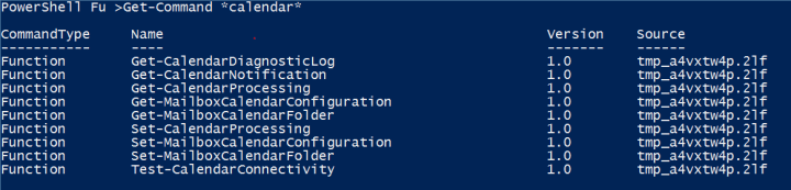 If the Reminder settings are not configured by a property on the Get-Mailbox cmdlet, we must determine where that setting exists. Let’s check in the EMS by searching for any cmdlets that are related to Calendar configuration. The following search query will reveal any cmdlets that contain the noun calendar: