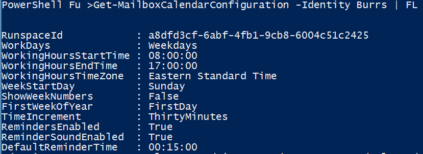 Get-MailboxCalendarConfiguration -Identity Burrs | Format-List