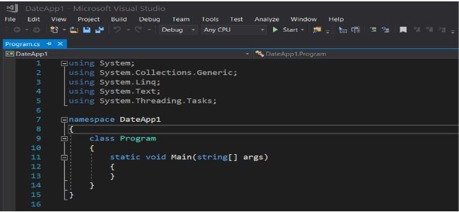 Once all the settings are configured, hit “OK”. You will now see below in Figure 10, a window with a basic structure of your C# program.