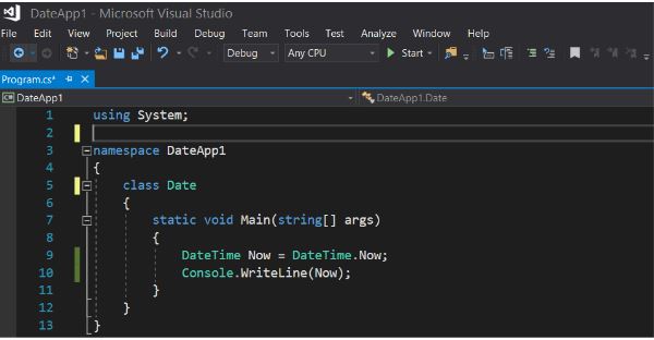 Figure 13 shows the structure of our DateTime app after removing the unused .Net namespaces, changing the Class name and adding the code to produce the current date on the screen. To achieve this, create a variable called “Now” and assign it to the DateTime.Now property. In C#, a variable is created by preceding the variable name with the name of the .Net class it’s using. And finally, add the Console.Writeline method with a “Now” argument. Also, notice the “System” namespace is now highlighted, which indicates it’s being used.