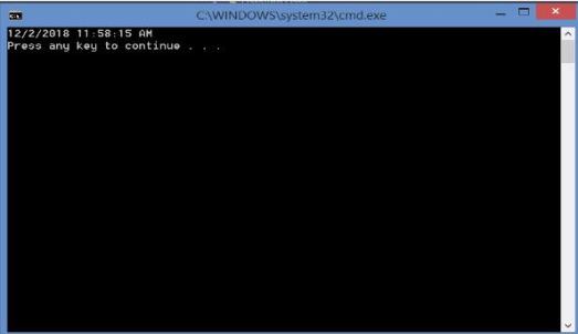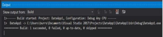 To compile and execute the above code, press CTRL + F5. If the build is successful, you will get a pop-up Command window showing the current date and time(Figure 14). By default, it’s displayed in a long date and time format.