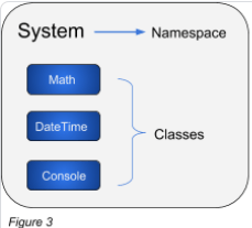 Due to the number of classes, they need to be organized in a manner that is based on their function. This is the purpose of a Namespace – a container of related classes. In Figure 3 below, we see illustrated the structure of a .Net Framework namespace called “System”. The System namespace consists of multiple classes such as Console, DateTime, Math and many more not presented in the diagram. Powershell commands and C# code use namespaces to produce and manipulate instantiated instances (objects) of these classes, which contains various methods and properties.