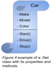 As mentioned, within each namespace are classes A class (Figure 4) is a container that consists of various methods and types. Methods allow you to perform certain actions against an object referenced by a class and a type describes its properties. In essence, a class can be seen as the blueprint used to build objects. For Instance, if you have a class called “Car”, it may have the following type categories: make, model, color, year, etc. Also, it will have methods which determine the actions that can be performed against a “Car” object such as: start(), drive(), stop() and so on. The types and methods of a class are known as the class members.