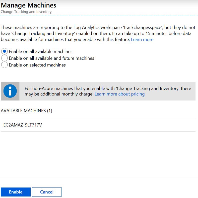 Now you can see the AWS EC2 instance as an available machine.  You have three options to choose on how to enable Change Tracking and Inventory.  I select the default to “Enable on all available machines and click enable.