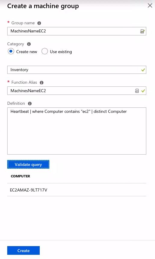 You can create your own Machine group as well.  Click on “Create a Machine Group” on the Inventory screen and fill in the fields on the popup window below.  Here, I’m creating a group of machines that contain “EC2” in the name.  Once you enter a query in the definition box, validate the query and then create it.  A more practical use case would be a group of machines that are missing updates.