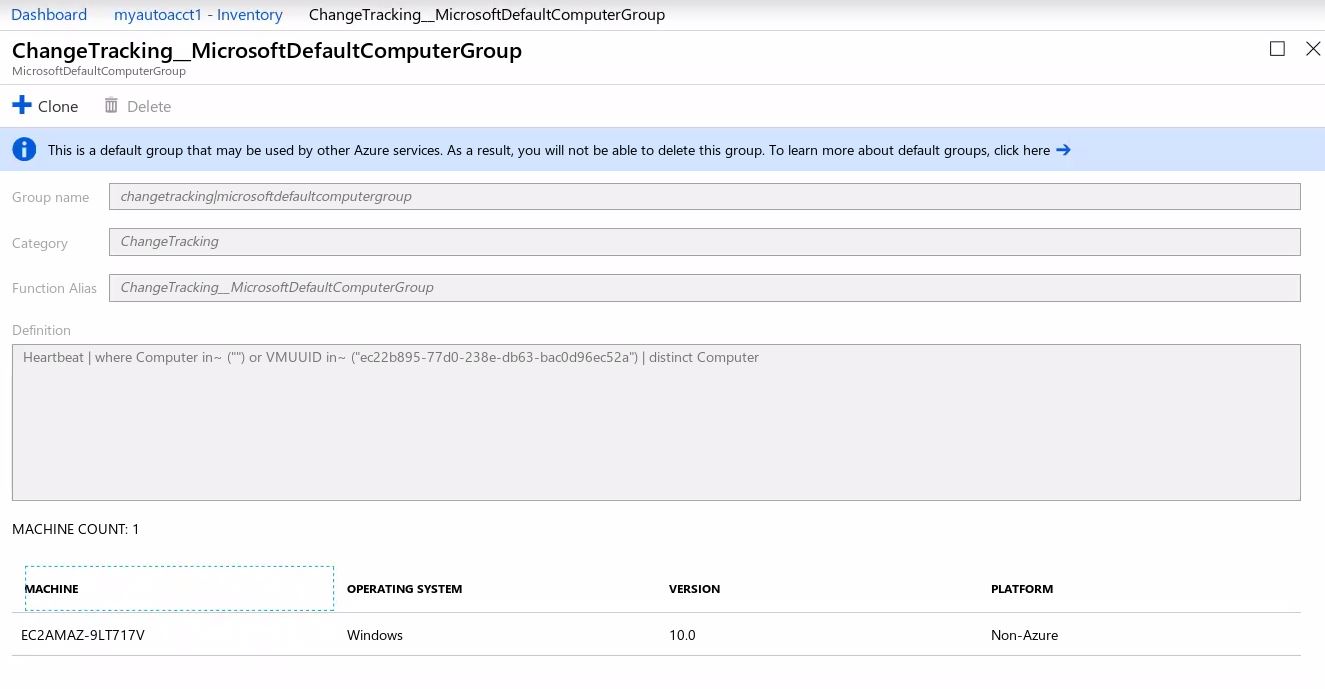 A Machine group is a group of machines defined by a Log Analytics KQL query.  For instance, if you go to Machine groups and select the “MicrosoftDefaultComputerGroup“, you can see the query that was used to generate the group as well as member machines.