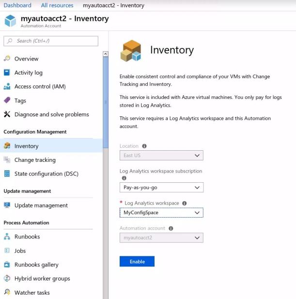 In the Azure portal, go to your Automation account and select “Inventory” under Configuration Management.  On the popup screen that appears, select your subscription and the Log Analytics Workspace in the drop-down menus, and click on the enable button. This step will also enable Change Tracking.