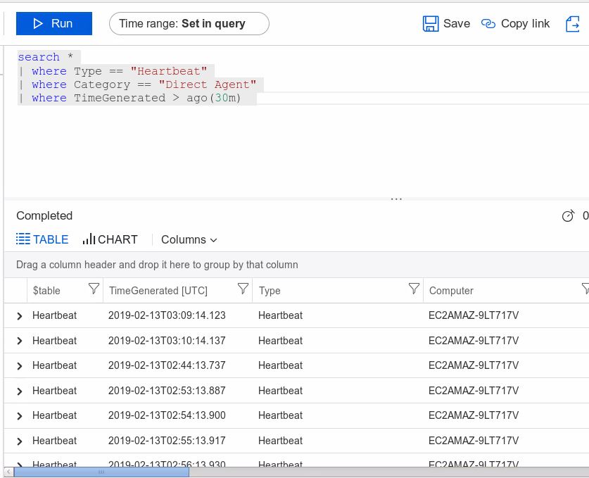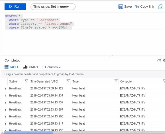 Also, in the Azure Portal, you can run a search query to check that the agent has a heartbeat and is communicating with Log Analytics.  Go to the Logs tab on your Workspace to run the query. The following figure shows there’s a heartbeat detected from the AWS EC2 instance.