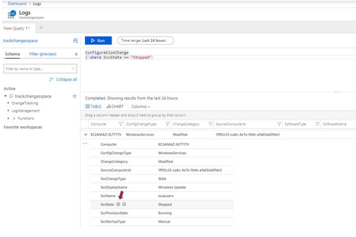 What if you want to run a query of all Windows services that are stopped? In the top pane, you can write a KQL query that searches in the ConfigurationChange table for all services whose SvcState is equal to stopped in the following format: