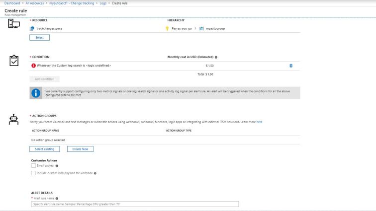 Lastly, Change Tracking provides the ability to configure alert rules if you would like to receive notifications on certain changes. In the Logs window, click on “New alert rule” to set this up. In the screen blow, set the resource as the Workspace used by Change tracking, add the appropriate logic for the condition and define how to receive notifications under Action groups. You can have the alerts emailed or sent via text messages.