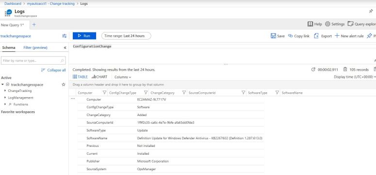 In the left side pane, there’s a schema that is built on the Workspace called “Trackchangesspace” that Log Analytics uses for Change tracking. In here there are two databases: ChangeTracking and LogManagement, which holds records of the data collected by the Tracking tool. with the Change Tracking database expanded to show its tables ConfigurationChange and ConfigurationData. In the main window is where queries are executed and the results are shown. When you first open the Log Analytics page, all the changes collected in the last 24 hours are displayed by default in a tabular view.
