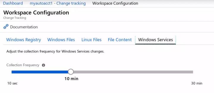 Lastly, let’s see what can be done under “Windows Services”. The tracking for Windows services is enabled by default, but you can adjust the frequency that changes to them are reported. The default setting is every 30 minutes, but you can adjust to anywhere between that and 10 seconds. Here, I set the collection frequency to 10 minutes.