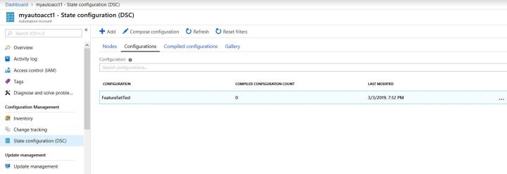 If you select “Configurations“, there’s an option to upload a configuration file or compose one in the Portal. I will click “Add” and upload a previously created config file called “WindowsFeatureSet.ps1 that will ensure the IIS and Web server features are enabled.