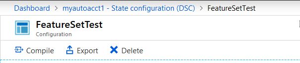 Import-AzureRmAutomationDscConfiguration -ResourceGroupName myautogroup –AutomationAccountName myautoacct1 -SourcePath $env:userprofile\Desktop\AzureAutomationDsc\WindowsFeaturSet.ps1 -Published –Force $jobData = Start-AzureRmAutomationDscCompilationJob -ResourceGroupName myautogroup –AutomationAccountName myautoacct1 -ConfigurationName Featureset $compilationJobId = $jobData.Id Get-AzureRmAutomationDscCompilationJob -ResourceGroupName myautogroup –AutomationAccountName myautoacct1 -Id $compilationJobId