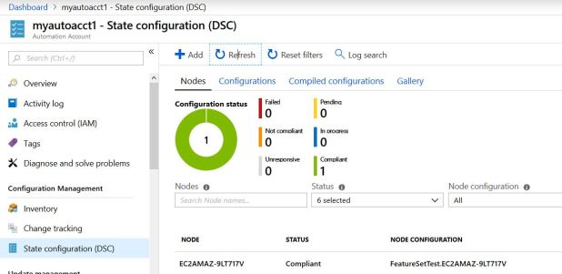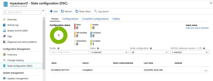 To verify that the AWS VM has been successfully onboarded, in the Azure portal, go to the Automation account. Under Configuration Management, click on State configuration (DSC) to go to the main where it shows the EC2 instance and it’s configuration status.