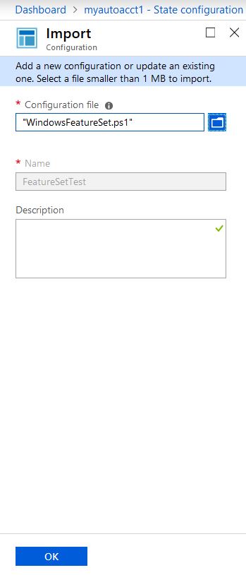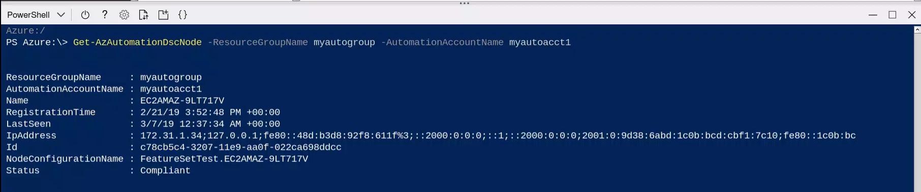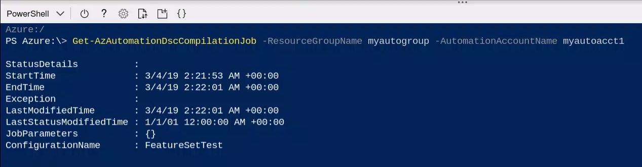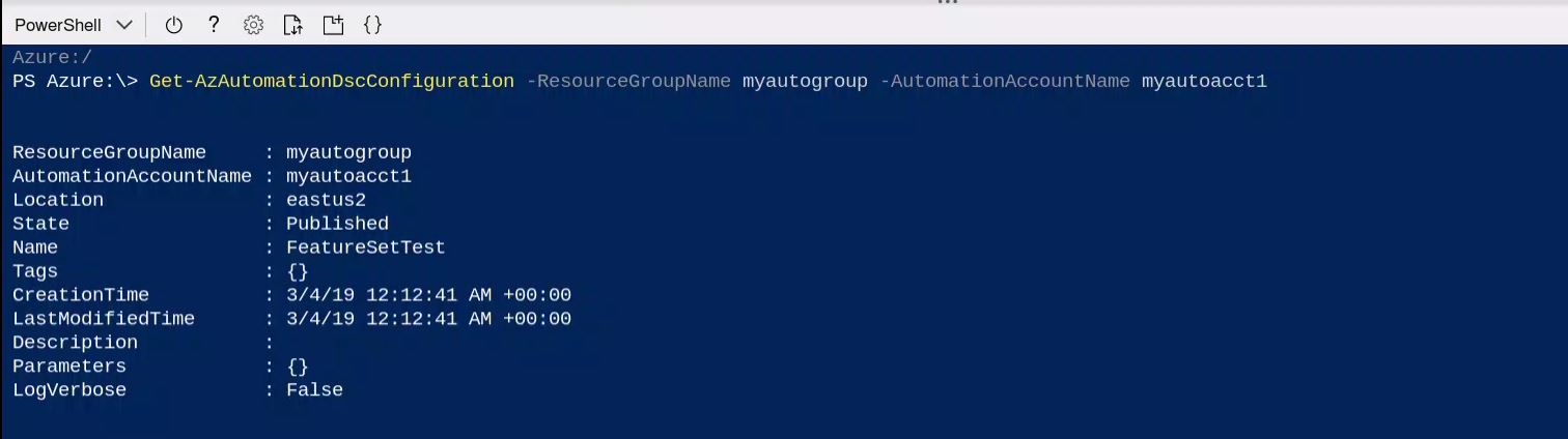Import-AzureRmAutomationDscConfiguration -ResourceGroupName myautogroup –AutomationAccountName myautoacct1 -SourcePath $env:userprofile\Desktop\AzureAutomationDsc\WindowsFeaturSet.ps1 -Published –Force $jobData = Start-AzureRmAutomationDscCompilationJob -ResourceGroupName myautogroup –AutomationAccountName myautoacct1 -ConfigurationName Featureset $compilationJobId = $jobData.Id Get-AzureRmAutomationDscCompilationJob -ResourceGroupName myautogroup –AutomationAccountName myautoacct1 -Id $compilationJobId