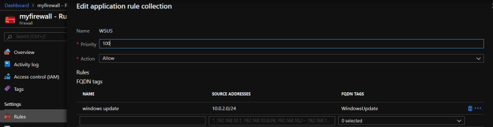 - FQDN Tags – represent a group of fully qualified domain names of Microsoft services such as Windows Update or Azure Backup. Like Service tags, they are maintained by Microsoft and cannot be customized. There are a significantly fewer number of FQDN tags than Service tags. Go here to see the list of FQDN tags. Here’s an example of FQDN tag I have for Windows Update in my Azure Firewall application rule. This allows you to avoid creating multiple application rules for each of the numerous Windows Update endpoints. One tag to rule them all!